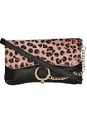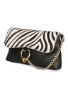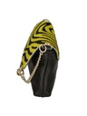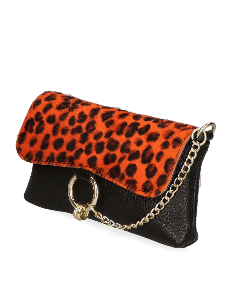 The contrast between the wild texture of the orange calf hair and the sleek black leather creates a dynamic and eye-catching effect. A secure zip closure and a 24-inch metal chain strap offer both practicality and versatility.