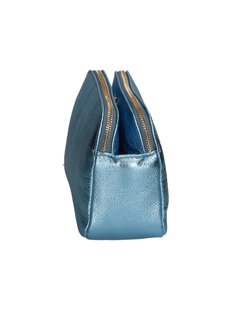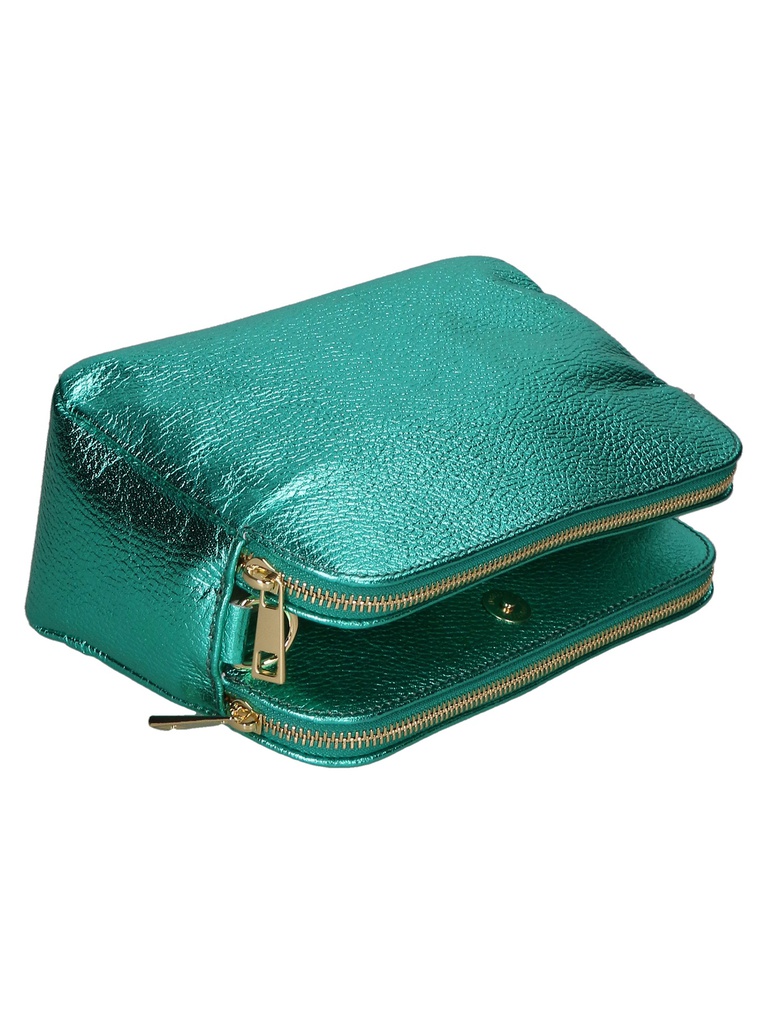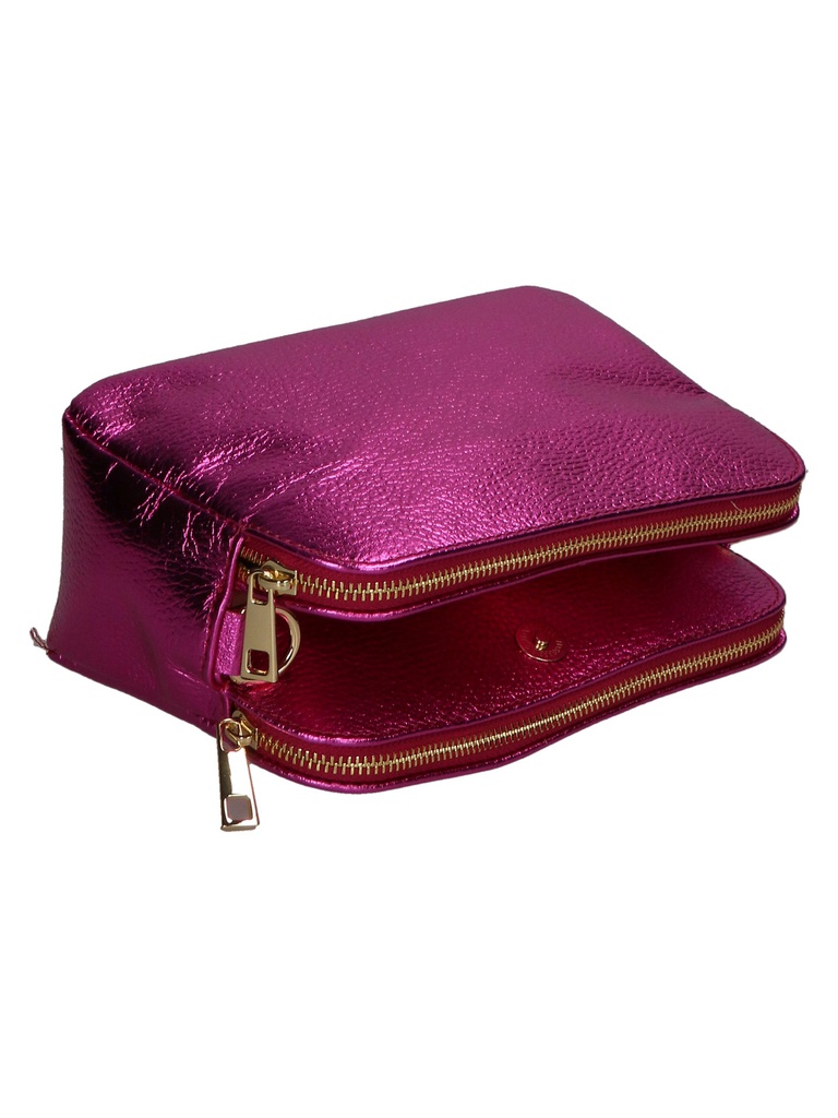 La sua texture unica e la finitura brillante catturano la luce, rendendola perfetta per eventi serali o per aggiungere un tocco glamour al tuo look quotidiano. L'interno, foderato in morbido misto cotone e poliestere, offre un ambiente protettivo per i tuoi oggetti essenziali, mentre la chiusura a zip garantisce sicurezza e praticità.