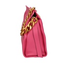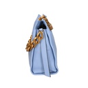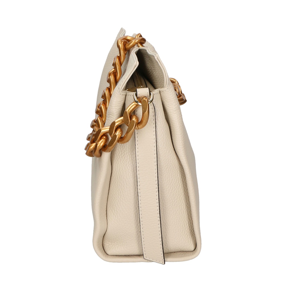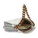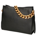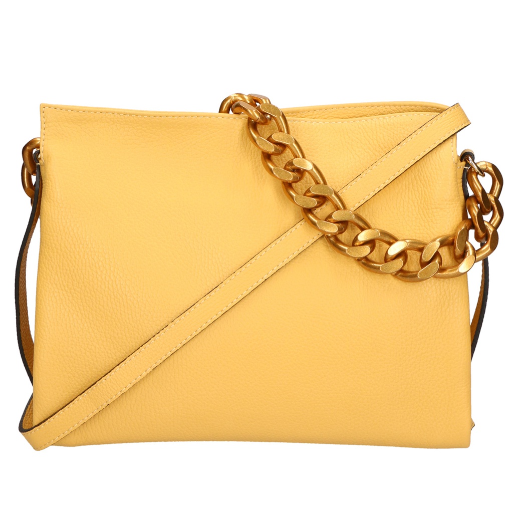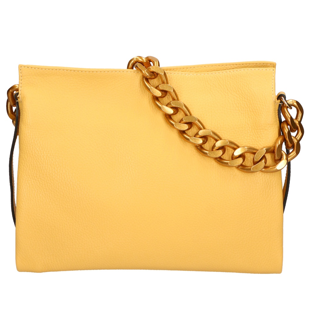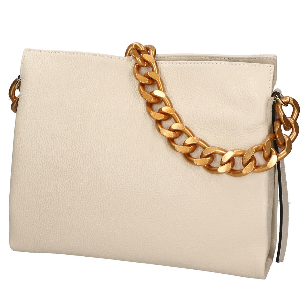 La sua silhouette pulita e minimalista è arricchita da una catena metallica dorata, che aggiunge un tocco di lusso e raffinatezza. La chiusura a zip garantisce sicurezza e praticità, mentre l'interno foderato in cotone e poliestere offre spazio sufficiente per tutti gli essenziali quotidiani.