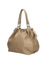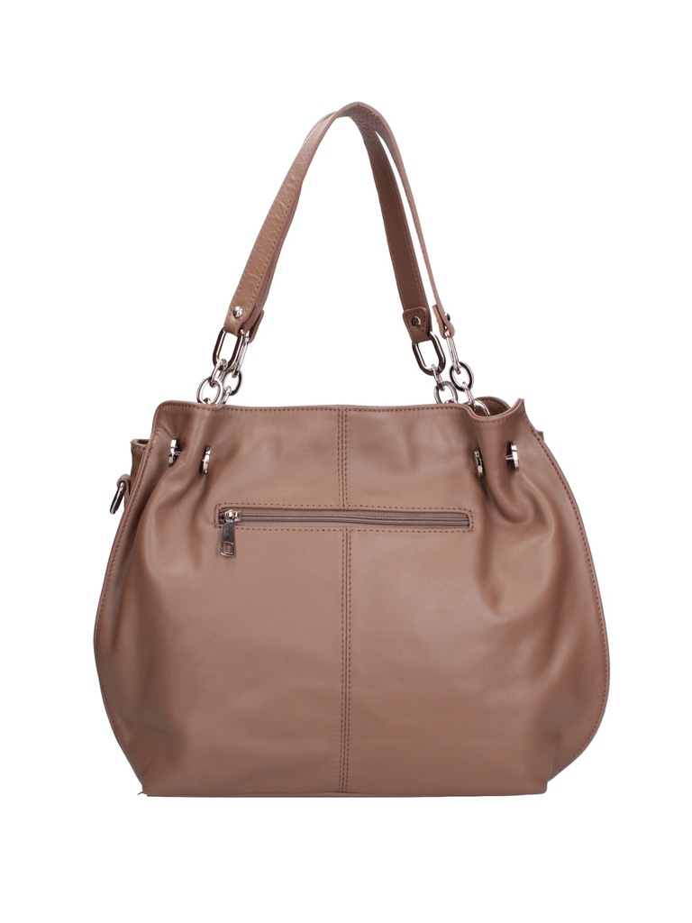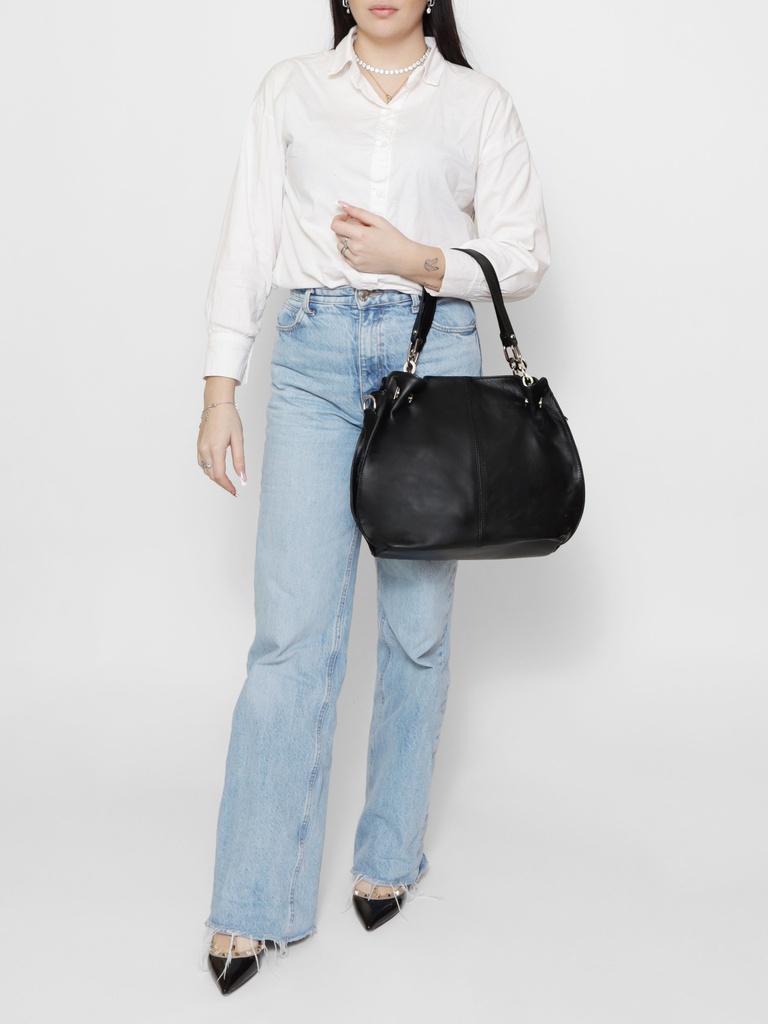 La sua silhouette morbida e fluente è accentuata da dettagli ricercati, come la chiusura a zip che garantisce sicurezza e praticità. L'interno, foderato in un mix confortevole di cotone (70%) e poliestere (30%), offre ampio spazio per organizzare i tuoi effetti personali. La struttura interna, rinforzata con carta, conferisce stabilità e forma alla borsa.